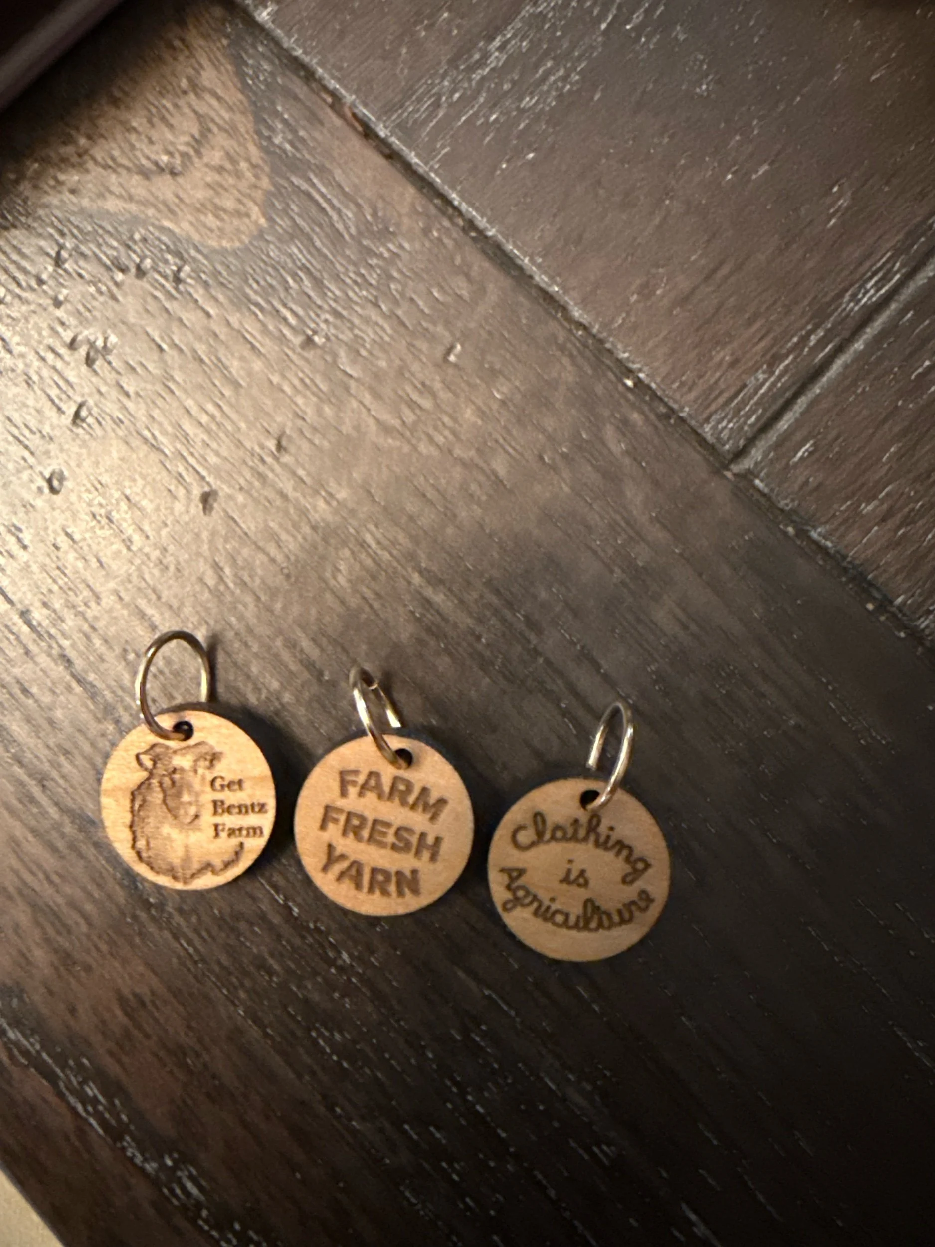 Well shucks! I got some amazing stitch markers. One is our farm logo, one says “farm fresh yarn” and the other says “clothing is agriculture “. Make a statement with your next project with my little stitch markers!