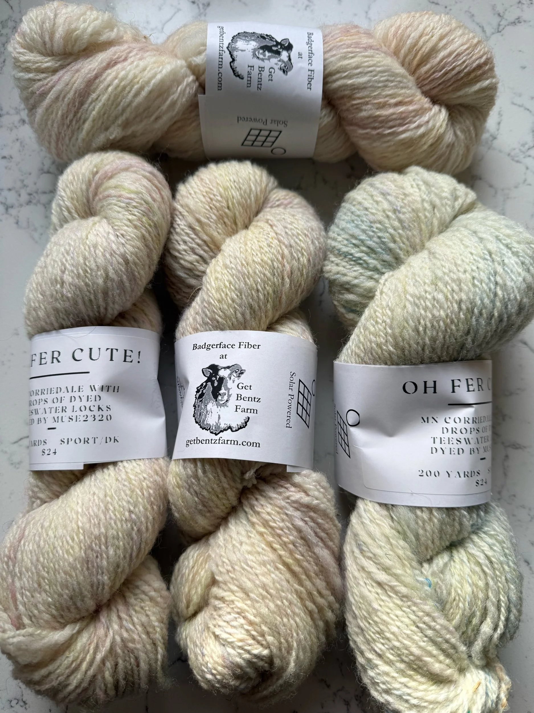 Each skein is 200 yards of sport-dk woolen spun delight! The Corriedale comes from my pals south of Rochester, and the locks that are dyed are also local. Send me a note with your color preferences and i’ll work with you to find the right skeins for your project.