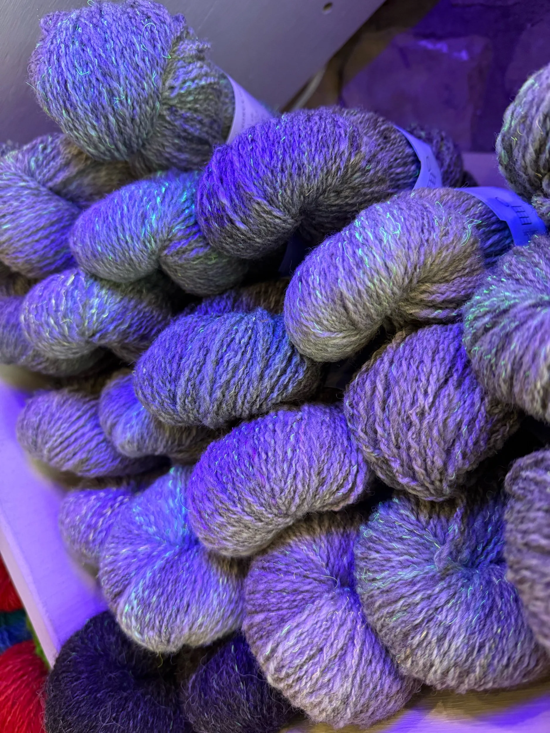 Each skein is 200 yards of a pale gray sport weight 2 ply. 100% local fine wool and woolen spun for lofty goodness. The firestar added was dyed by the amazing MUSE2320 into a variety of black light reactive colors, which give the yarn a marled color look that will ceatch the light during the day. This yarn is a delightful knit, very soft and squishy, and oh so fun to work with as the different colors pop out.