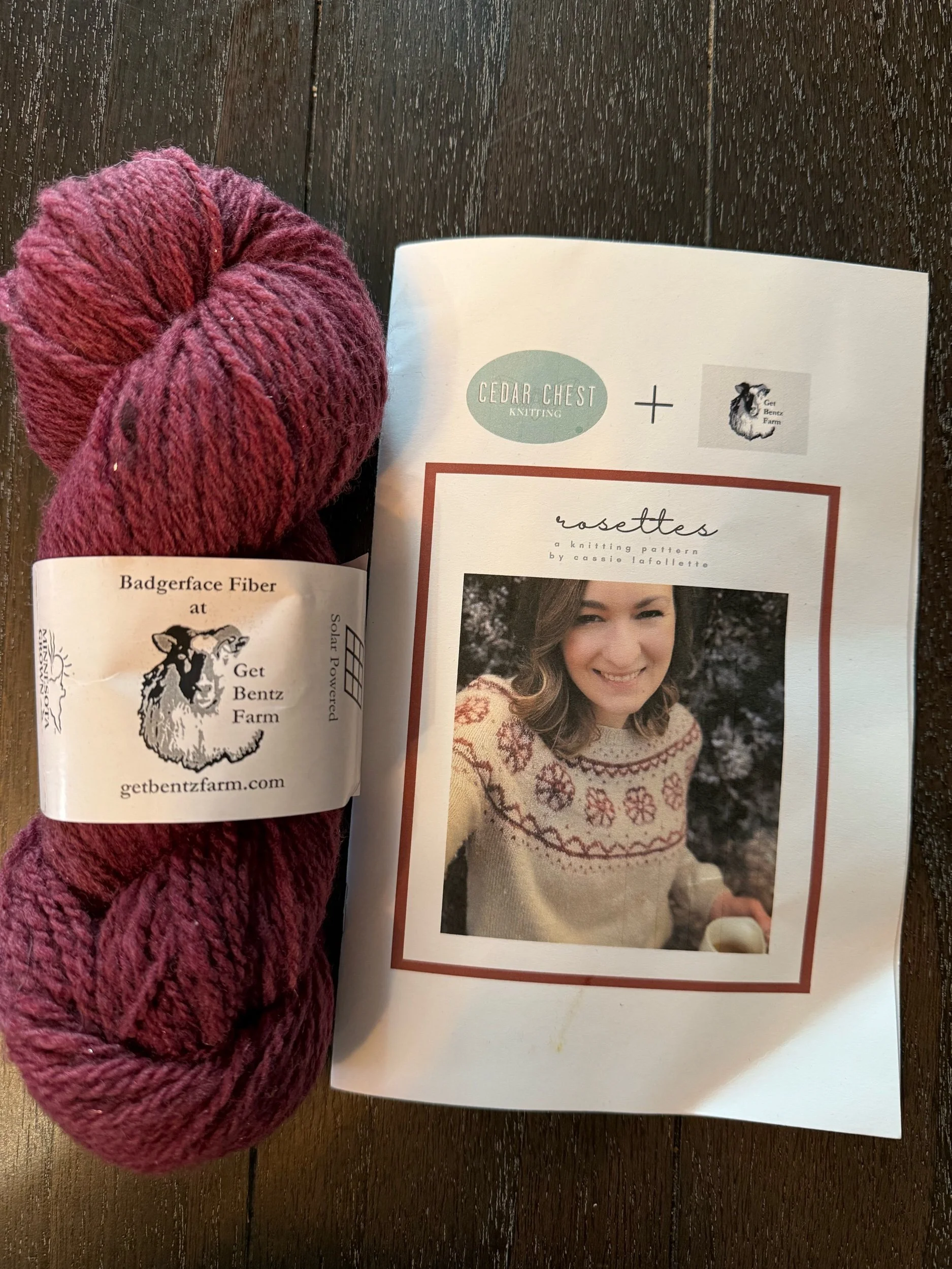 Each kit comes with 1 skein of Colored Snow, 200 yards 2 ply DK, naturally dyed by Salt of the North. And one printed pattern with a link to download the pattern on Ravelry. The pattern can be seen here https://www.ravelry.com/patterns/library/rosettes-sweater